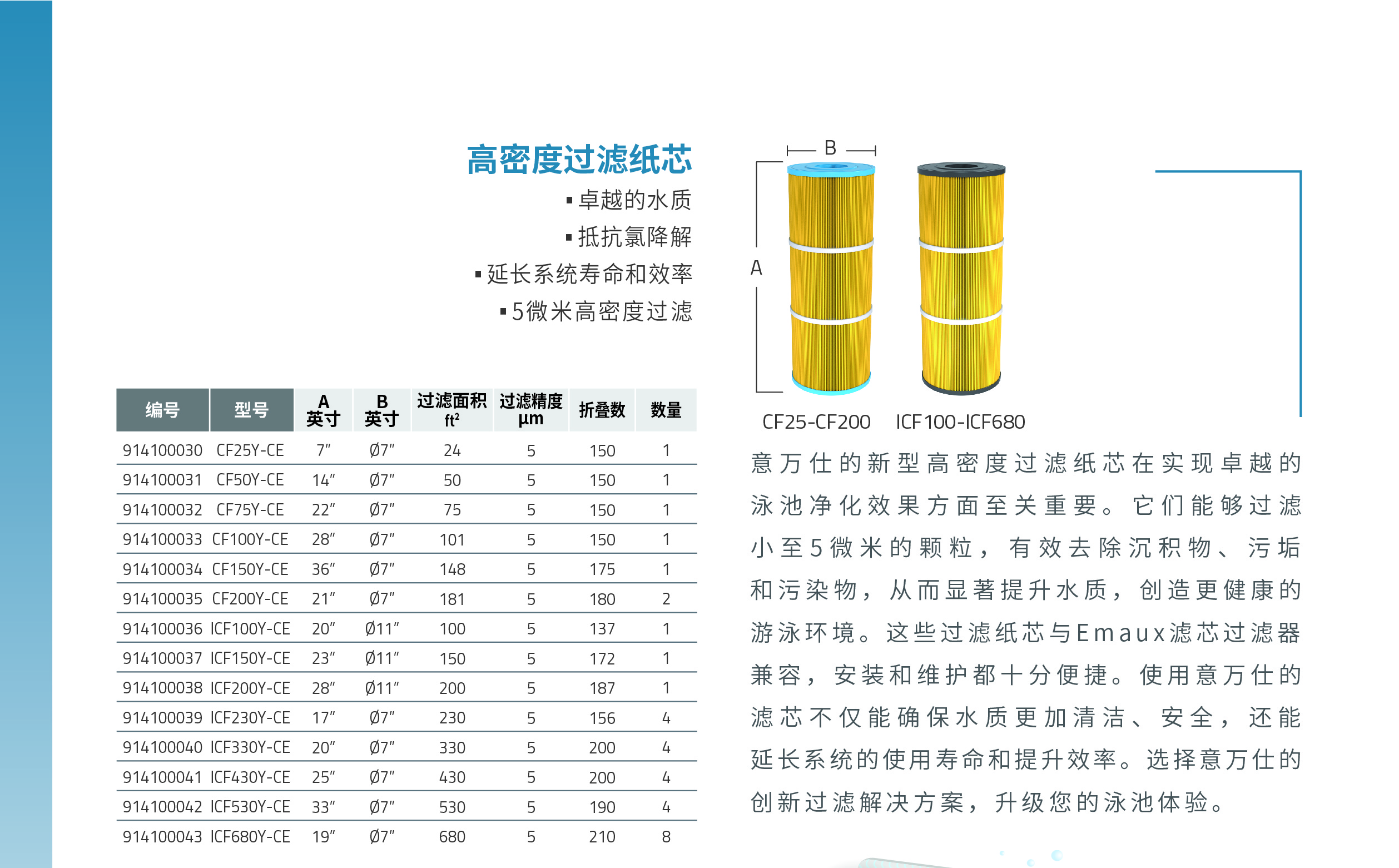 意萬仕的新型高密度過濾紙芯在實(shí)現(xiàn)卓越的 泳池凈化效果方面至關(guān)重要。它們能夠過濾 小至5微米的顆粒,有效去除沉積物、污垢 和污染物,從而顯著提升水質(zhì),創(chuàng)造更健康的 游泳環(huán)境。這些過濾紙芯與Emaux濾芯過濾器 兼容,安裝和維護(hù)都十分便捷。使用意萬仕的 濾芯不僅能確保水質(zhì)更加清潔、安全,還能 延長(zhǎng)系統(tǒng)的使用壽命和提升效率。選擇意萬仕的 創(chuàng)新過濾解決方案,升級(jí)您的泳池體驗(yàn)。