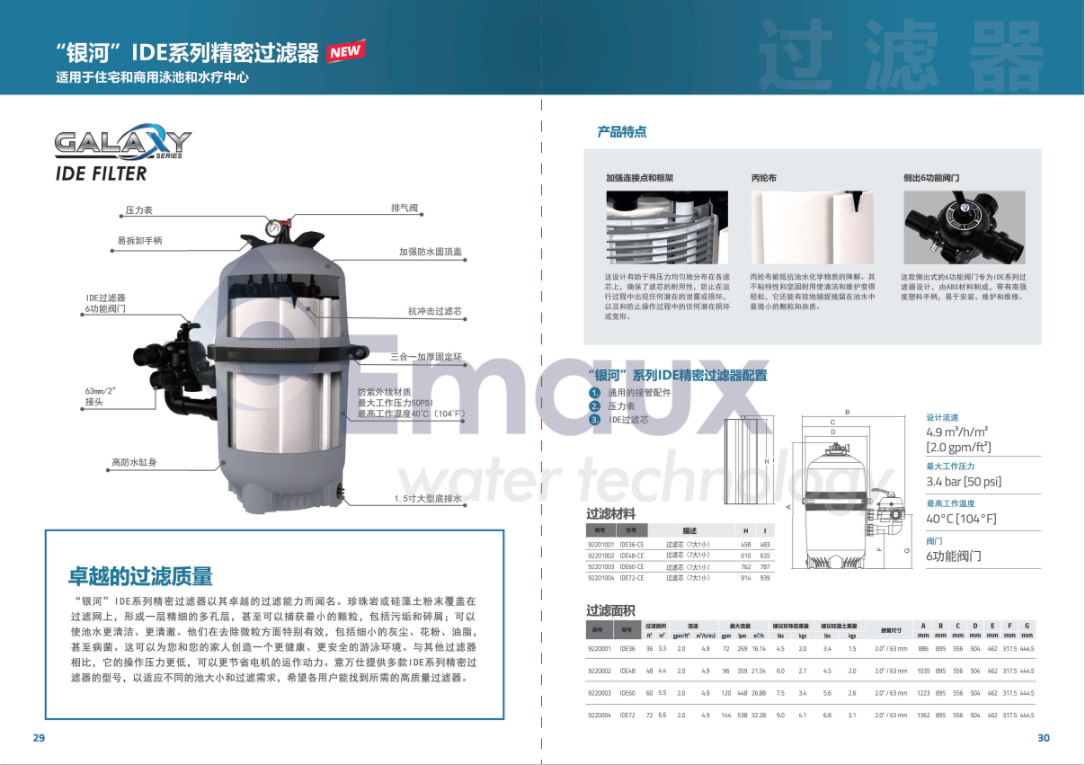 “銀河”IDE系列精密過濾器以其卓越的過濾能力而聞名。珍珠巖或硅藻土粉末覆蓋在 過濾網(wǎng)上,形成一層精細(xì)的多孔層,甚至可以捕獲最小的顆粒,包括污垢和碎屑;可以 使池水更清潔、更清澈。他們?cè)谌コ⒘7矫嫣貏e有效,包括細(xì)小的灰塵、花粉、油脂, 甚至病菌。這可以為您和您的家人創(chuàng)造一個(gè)更健康、更安全的游泳環(huán)境。與其他過濾器 相比,它的操作壓力更低,可以更節(jié)省電機(jī)的運(yùn)作動(dòng)力。意萬仕提供多款I(lǐng)DE系列精密過 濾器的型號(hào),以適應(yīng)不同的池大小和過濾需求,希望各用戶能找到所需的高質(zhì)量過濾器。