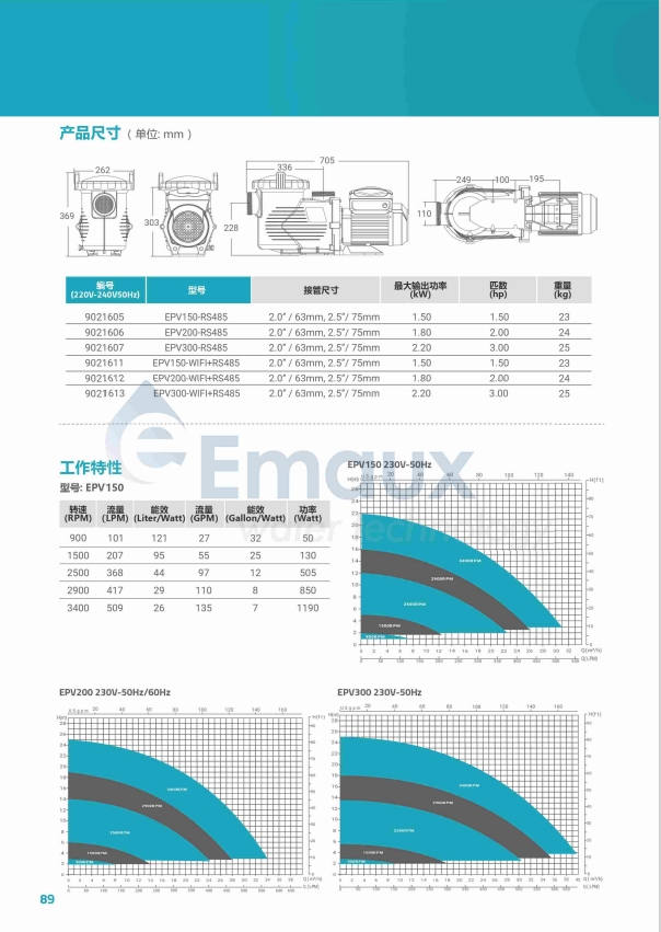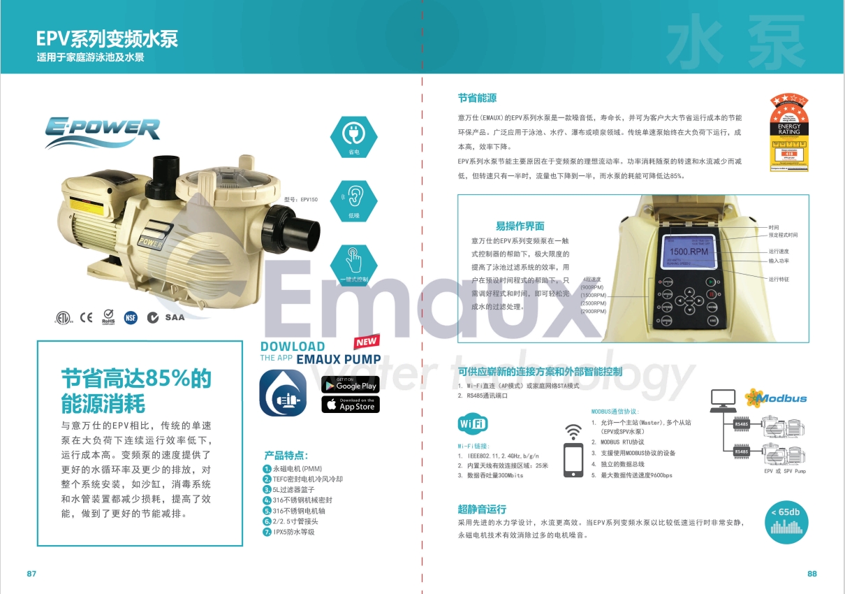 與意萬仕的EPV相比,傳統(tǒng)的單速泵在大負(fù)荷下連續(xù)運(yùn)行效率低下,運(yùn)行成本高。變頻泵的速度提供了更好的水循環(huán)率及更少的排放,對(duì)整個(gè)系統(tǒng)安裝,如沙缸,消毒系統(tǒng) 和水管裝置都減少損耗,提高了效能,做到了更好的節(jié)能減排。
