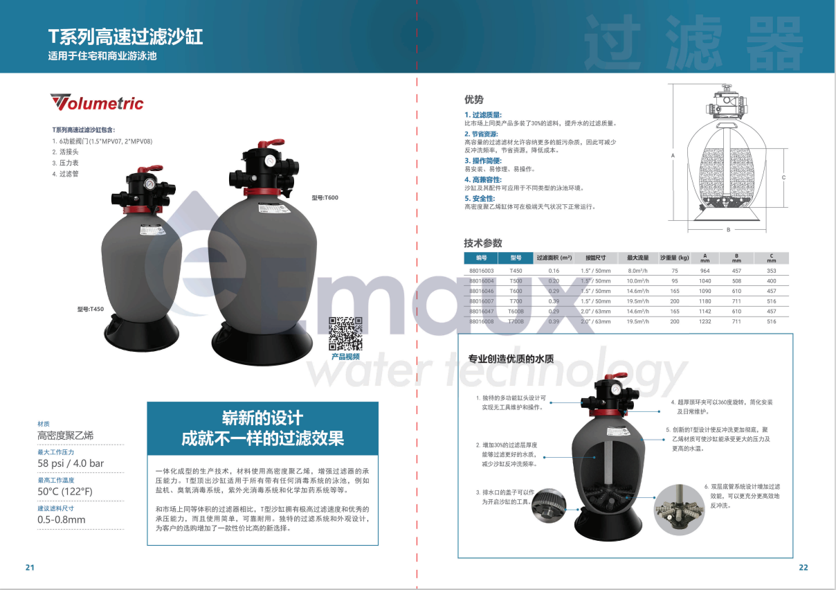 競技池一體化成型的生產(chǎn)技術(shù),材料使用高密度聚乙烯,增強過濾器的承壓能力。T型頂出沙缸適用于所有帶有任何消毒系統(tǒng)的泳池,例如鹽機、臭氧消毒系統(tǒng),紫外光消毒系統(tǒng)和化學(xué)加藥系統(tǒng)等等。 和市場上同等體積的過濾器相比,T型沙缸擁有極高過濾速度和優(yōu)秀的承壓能力,而且使用簡單,可靠耐用。獨特的過濾系統(tǒng)和外觀設(shè)計,為客戶的選購增加了一款性價比高的新選擇。