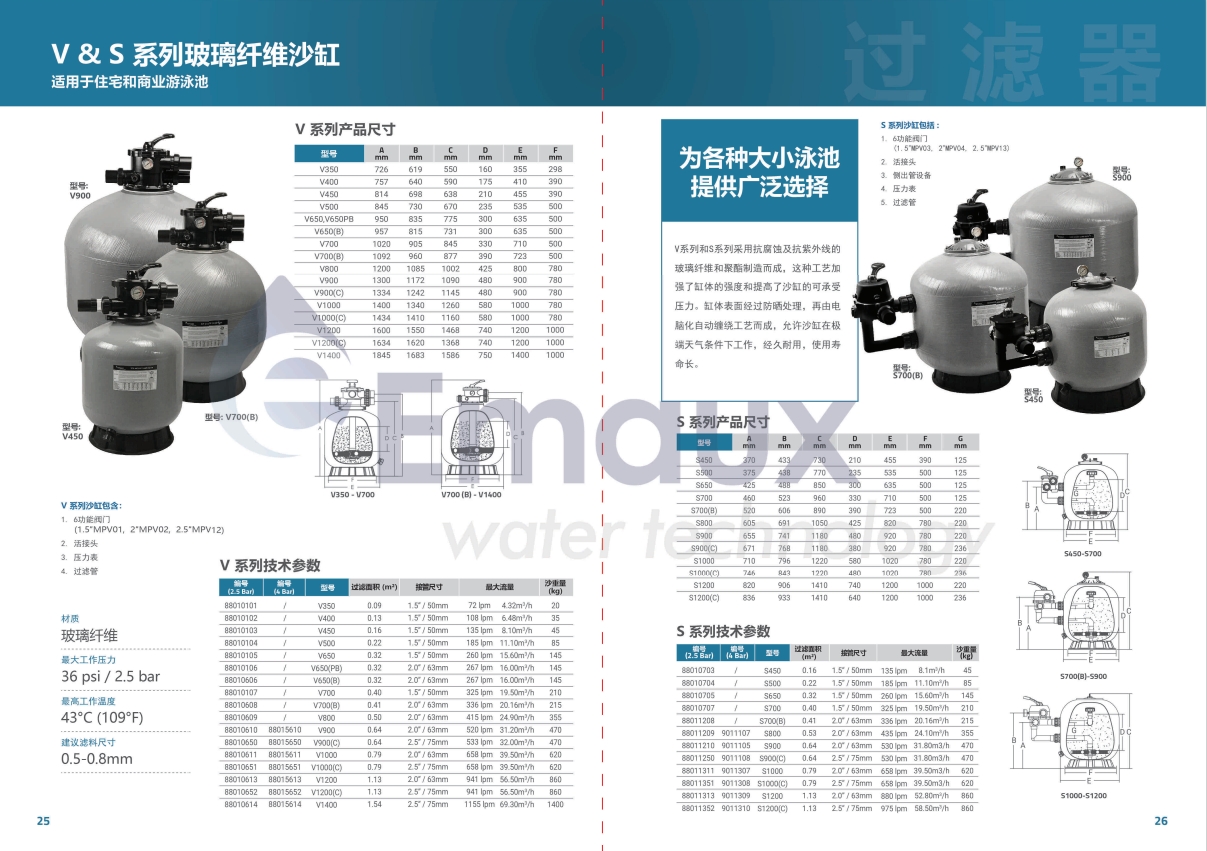 競技池V系列和S系列采用抗腐蝕及抗紫外線的玻璃纖維和聚酯制造而成,這種工藝加強了缸體的強度和提高了沙缸的可承受壓力。缸體表面經(jīng)過防曬處理,再由電腦化自動纏繞工藝而成,允許沙缸在極端天氣條件下工作,經(jīng)久耐用,使用壽命長。