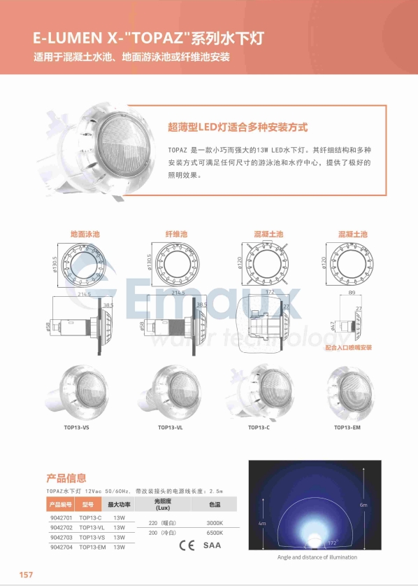 競技池TOPAZ 是一款小巧而強(qiáng)大的13W LED水下燈。其纖細(xì)結(jié)構(gòu)和多種安裝方式可滿足任何尺寸的游泳池和水療中心,提供了極好的照明效果。