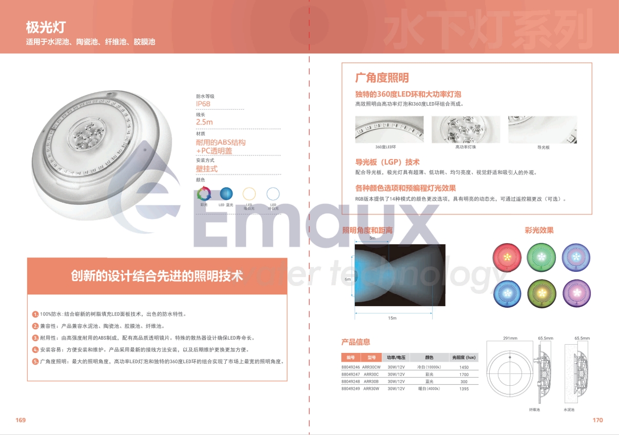 競技池1. 100%防水:結合嶄新的樹脂填充LED面板技術,出色的防水特性。 2. 兼容性:產品兼容水泥池、陶瓷池、膠膜池、纖維池 3. 耐用性:由高強度耐用的ABS制成,配有高品質透明鏡片。特殊的散熱器設計確保LED壽命長 4. 安裝容易:方便安裝和維護。產品采用最新的接線方法安裝以及后期維護更換更加方便 5. 廣角度照明:最大的照明角度高功率LED燈泡和獨特的360度LED環(huán)的組合實現了市場上最寬的照明角度