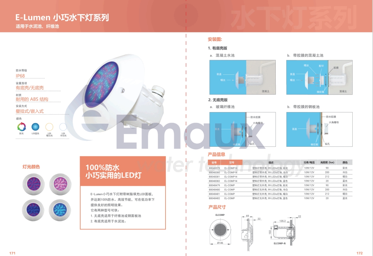 競(jìng)技池E-Lumen小巧水下燈附帶樹脂填充LED面板,并達(dá)到100%防水。高效節(jié)能,可在低功率下提供良好的照明效果。 E-Lumen它有兩種型號(hào)可供: 無底殼適用于纖維池或鋼面板池;有底殼適用于水泥池。