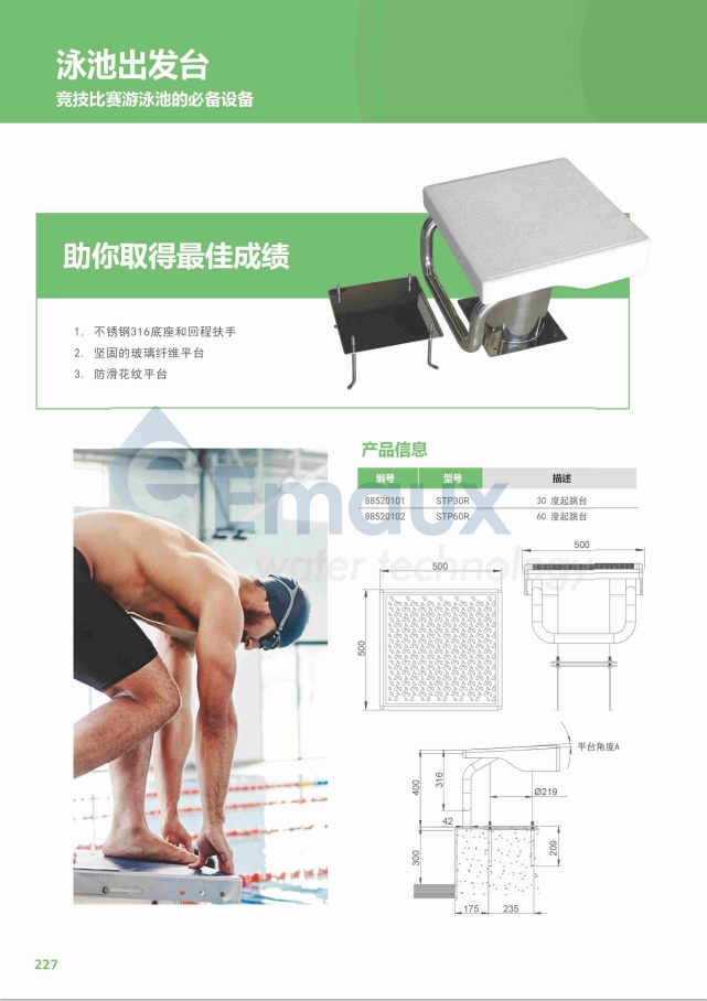 競技池1. 不銹鋼316底座和回程扶手 2. 堅固的玻璃纖維平臺 3. 防滑花紋平臺