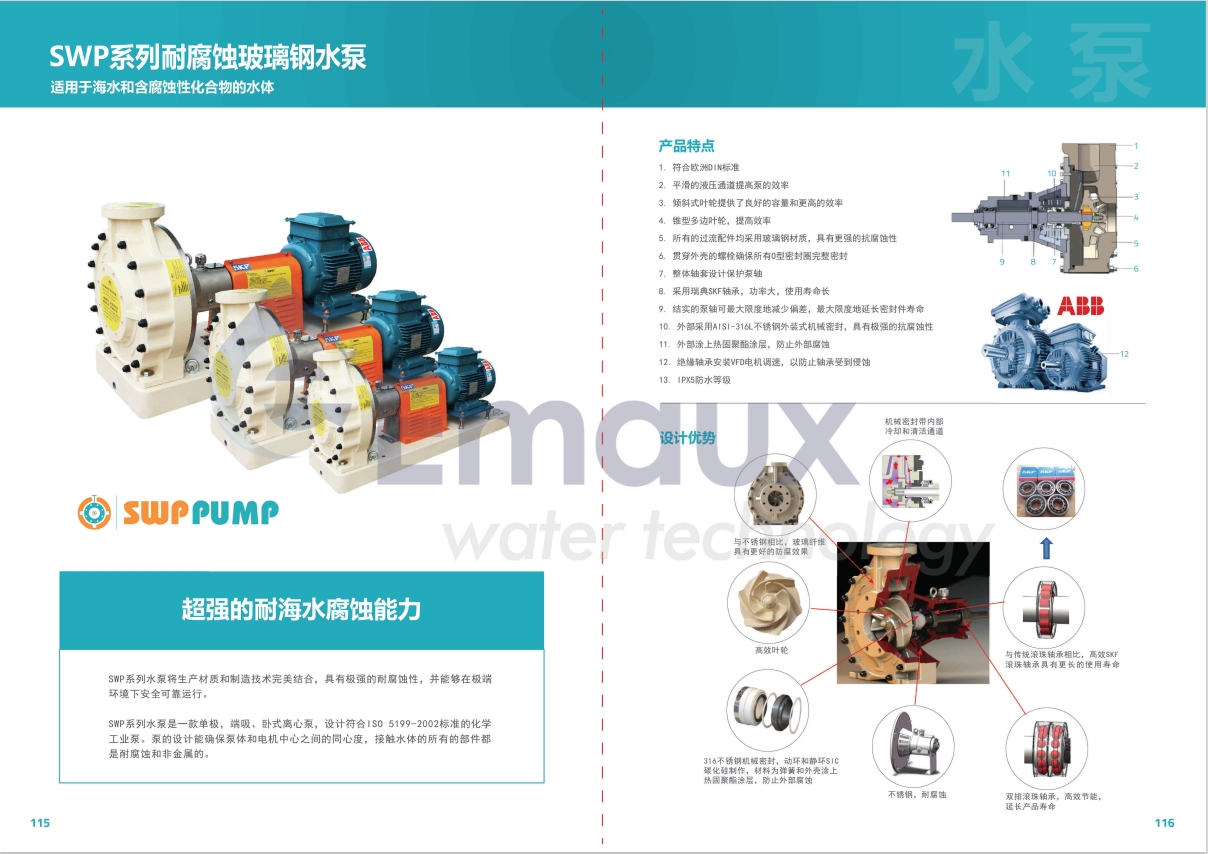 SWP系列水泵將生產(chǎn)材質(zhì)和制造技術(shù)完美結(jié)合,具有極強(qiáng)的耐腐蝕性,并能夠在極端環(huán)境下安全可靠運(yùn)行。 SWP系列水泵是一款單極,端吸、臥式離心泵,設(shè)計(jì)符合ISO 5199-2002標(biāo)準(zhǔn)的化學(xué)工業(yè)泵。泵的設(shè)計(jì)能確保泵體和電機(jī)中心之間的同心度,接觸水體的所有的部件都是耐腐蝕和非金屬的。