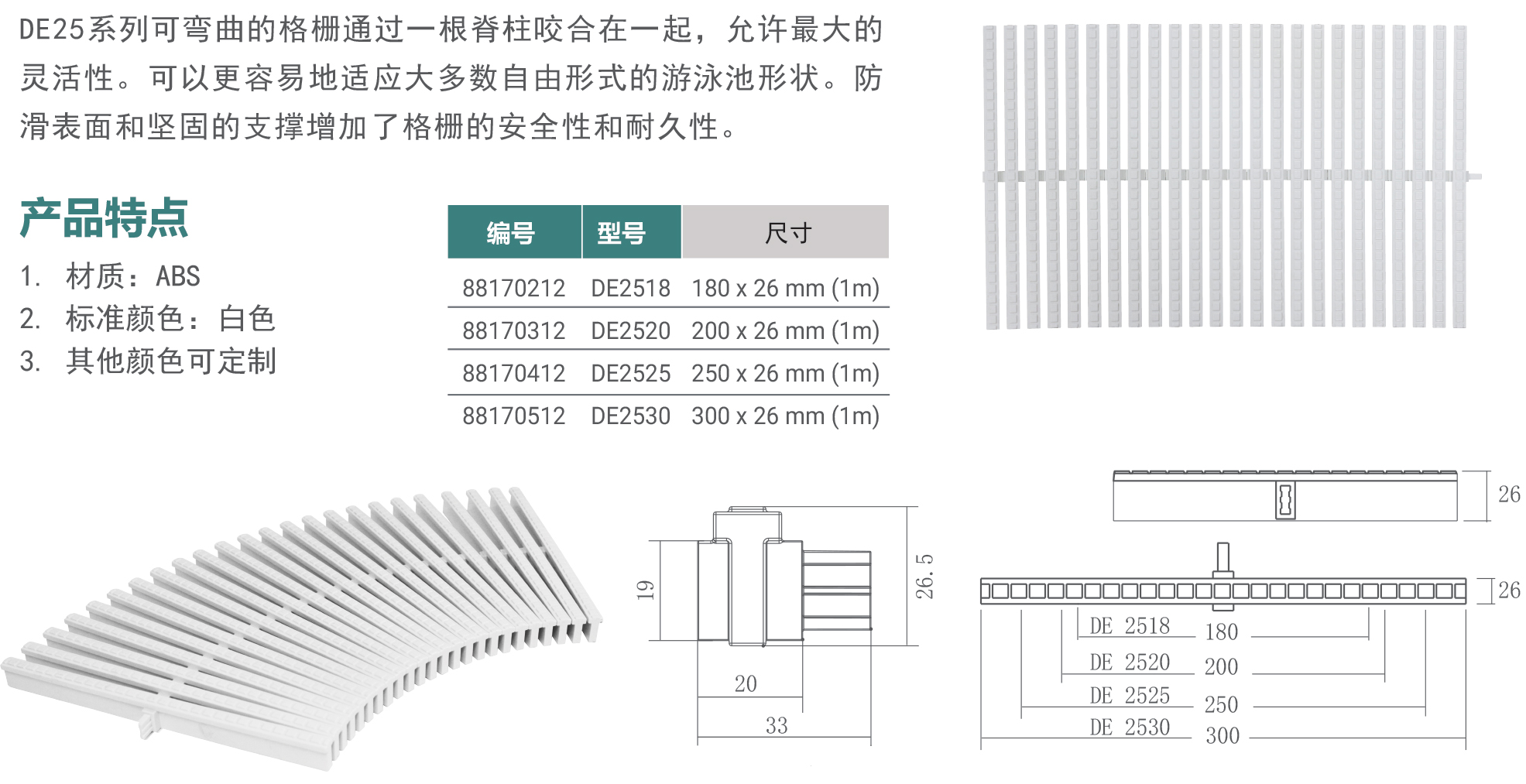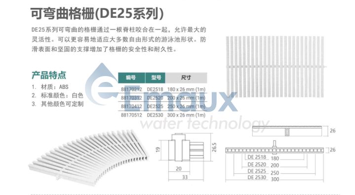 您的位置:首頁>產(chǎn)品概覽>泳池格柵>可彎曲格柵(DE25 系列)
