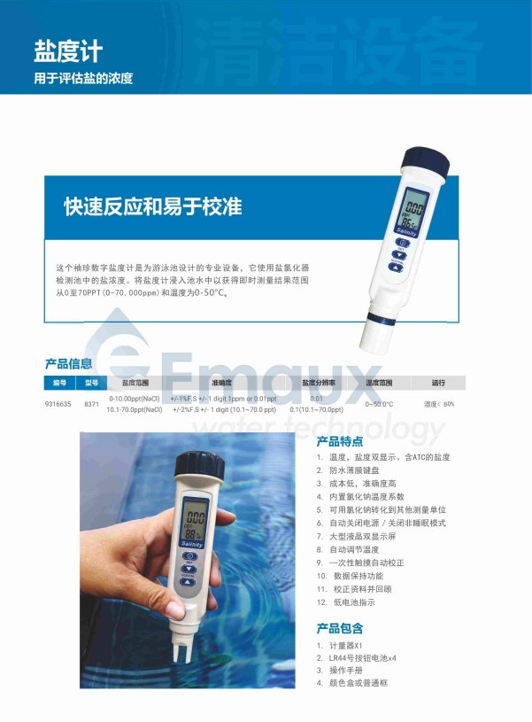 競(jìng)技池這個(gè)袖珍數(shù)字鹽度計(jì)是為游泳池設(shè)計(jì)的專業(yè)設(shè)備,它使用鹽氯化器檢測(cè)池中的鹽濃度。將鹽度計(jì)浸入池水中以獲得即時(shí)測(cè)量結(jié)果范圍從0至70PPT(O-70,000ppm)和溫度為0-50°C。